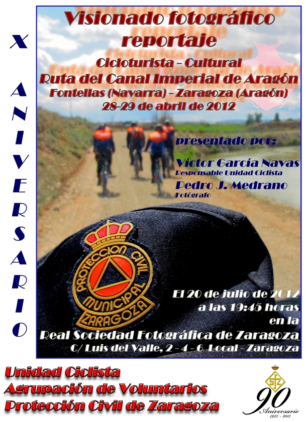 La Unidad Ciclista de la Agrupación de Voluntarios de Protección Civil de Zaragoza y nuestro socio Pedro Medrano, los días 28 y 29 de abril de 2012, realizaron la salida ciclo-turista-cultural desde Fontellas (Navarra) hasta Zaragoza (Aragón) siguiendo la ruta del Canal Imperial de Aragón en todo su recorrido. Victor García y Pedro Medrano nos mostrarán y comentarán este magnifico reportaje que nos acerca el Canal Imperial a la Real Sociedad Fotográfica de Zaragoza.