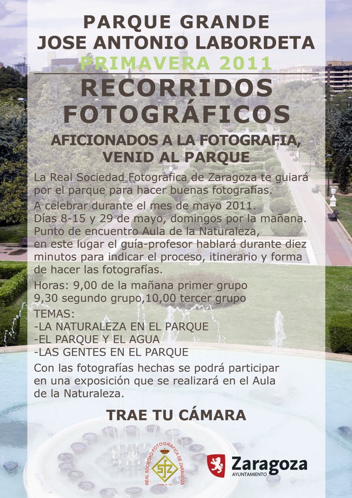 > Día 15 / domingo / 9,00 / 9,30 / 10,00 horas.: Recorridos fotográficos por el parque J. A. Labordeta «El parque y el agua» Entrada libre hasta completar el aforo de los grupos.